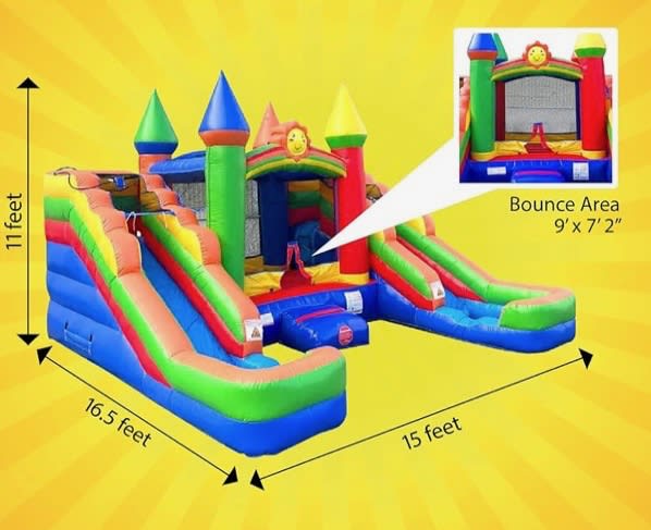 Featuring a 9 by 7 bounce area, the Rainbow Castle Dual Lane Combo Wet/Dry offers plenty of room for bouncing, sliding, and having a blast. This inflatable marvel includes two slides, allowing for twice the excitement and friendly races as kids zip down to the splash area or dry landing. Whether you're hosting an event during the sunny days of summer or the cooler months, this combo unit offers flexibility for both wet and dry play options. 🌊🛝