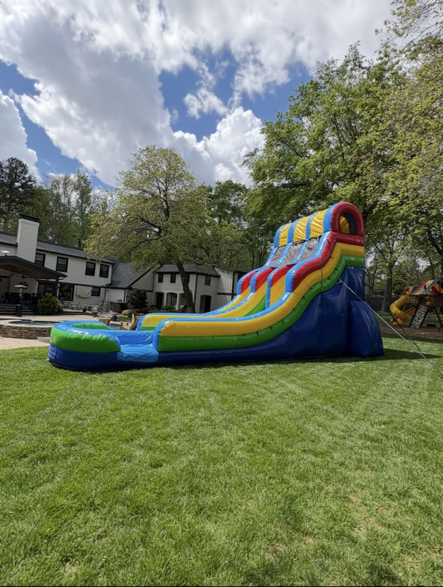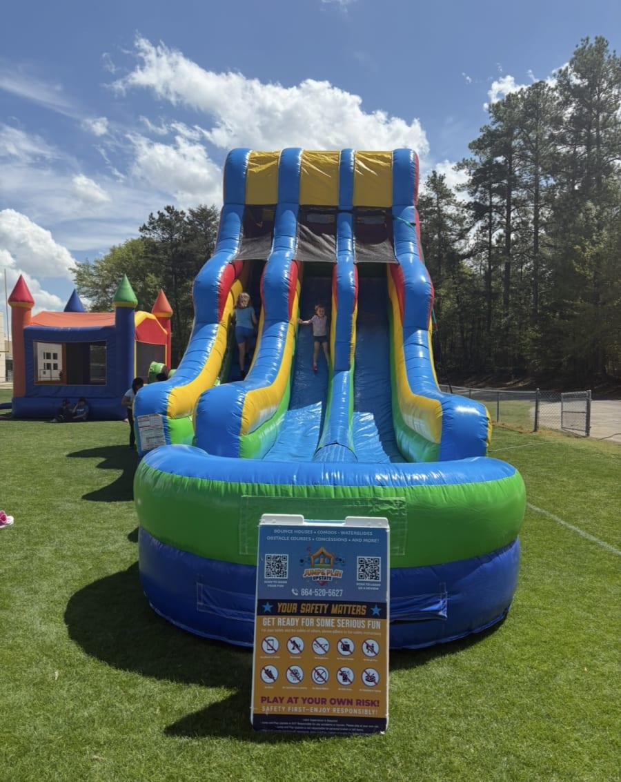 Our main services focus on parties school churches in Greenville, Simpsonville, Fountain Inn, Taylors, Greer, Easley, Travelers Rest, Piedmont, Ware Shoals, Anderson, Gantt, Wade Hampton, Parker, Berea, Spartanburg, and Laurens. The Rainbow Racer 24' Dual Wet/Dry Slide is a fantastic addition to any celebration in these areas, promising to elevate the fun and create lasting memories.