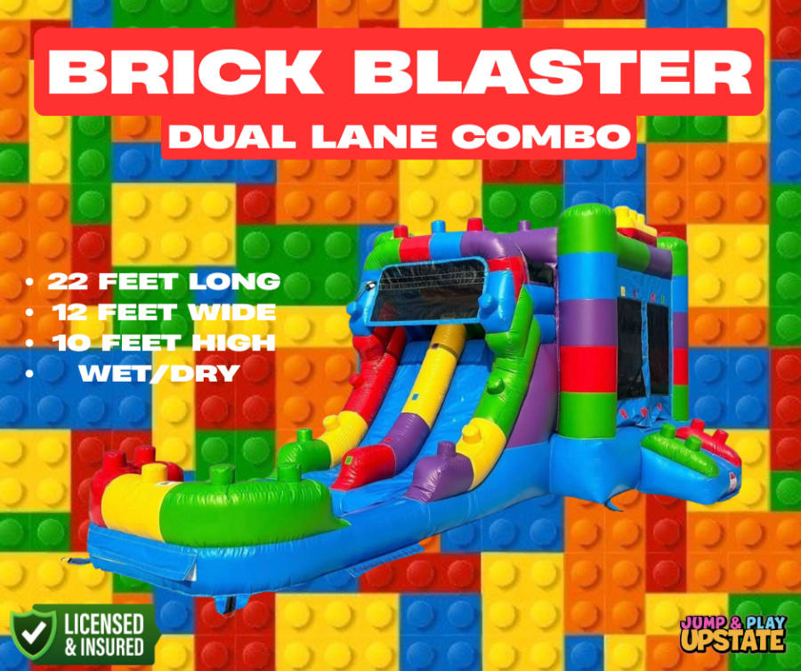 Looking to add excitement and endless entertainment to your next event? The Brick Blaster Dual Lane Combo Wet/Dry is the perfect choice for birthday parties, family gatherings, school events, and community celebrations. With its vibrant brick-themed design and dual slide lanes, this combo unit promises double the thrills and tons of smiles for both kids and adults! 🎉