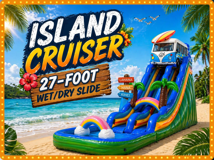 The Island Cruiser 27’ Slide Wet/Dry is a show-stopping water slide inflatable rental that turns any backyard, park, or event into a tropical playground. Fast setup. Durable construction. Safe, high-speed fun for kids and teens. Ideal for summer parties, company picnics, church events, and school fundraisers. ☀️🎉
