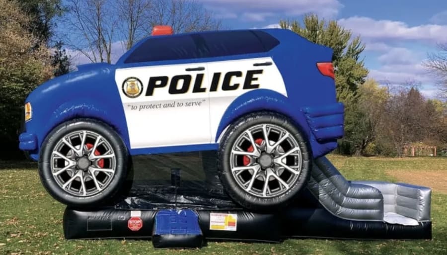 Our bounce house rental service delivers the Police Cruiser Combo Wet/Dry in Greenville, Simpsonville, Fountain Inn, Taylors, Greer, Easley, Travelers Rest, Piedmont, Ware Shoals, Anderson, Gantt, Wade Hampton, Parker, Berea, Spartanburg, Laurens. We ensure a hassle-free setup and takedown, bringing the excitement directly to your door. Organizing a party or event has never been easier!