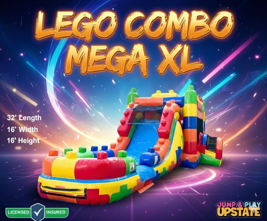 The Lego Combo Mega XL is a giant inflatable wet/dry combo built for big smiles and backyard thrills. Fast to set up. Safe for kids. Perfect for birthday parties, school events, and community gatherings. This inflatable combines a roomy bounce area, a twisting slide, and a splash zone for nonstop action. Ideal for families and event planners who want reliable, high-energy entertainment.