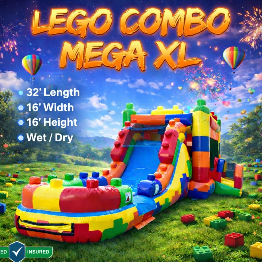 The Lego Combo Mega XL is a giant inflatable wet/dry combo built for big smiles and backyard thrills. Fast to set up. Safe for kids. Perfect for birthday parties, school events, and community gatherings. This inflatable combines a roomy bounce area, a twisting slide, and a splash zone for nonstop action. Ideal for families and event planners who want reliable, high-energy entertainment.