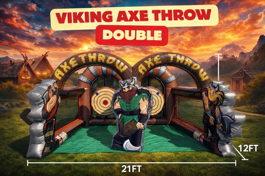 Looking for an exciting addition to your event? Our slide rental, water slide, game rentals in Greenville, Simpsonville, Fountain Inn, Taylors, Greer, Easley, Travelers Rest, Piedmont, Ware Shoals, Anderson, Gantt, Wade Hampton, Parker, Berea, Spartanburg, Laurens now include the Viking Ax Throw Dual Lane! Transform your ordinary gathering into an extraordinary experience with this interactive game.