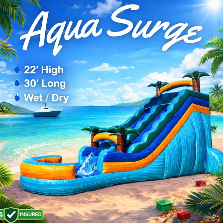Bring the thrill of the ocean waves to your location with our slide rental service. We proudly offer the slide rental Aqua Surge 22' Wet/Dry in Greenville, Simpsonville, Fountain Inn, Taylors, Greer, Easley, Travelers Rest, Piedmont, Ware Shoals, Anderson, Gantt, Wade Hampton, Parker, Berea, Spartanburg, and Laurens. Our team of professionals ensures timely delivery, setup, and takedown, so you can focus on enjoying the event 🚚✨