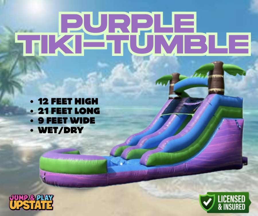 Ready to create unforgettable memories? Book the Purple Tiki-Tumble 12' Wet/Dry today with our main service + Purple Tiki-Tumble 12' Wet/Dry in delivery areas and bring ultimate fun to your event!