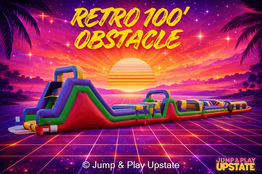 We service Simpsonville, Greenville, Mauldin, Five Forks, Fountain Inn, Greer, Taylors, Travelers Rest, Easley, Powdersville, Piedmont, Duncan, Lyman, Laurens, and Ware Shoals. Book the Retro 100' Obstacle Course to create memorable moments and competitive fun at your next event.